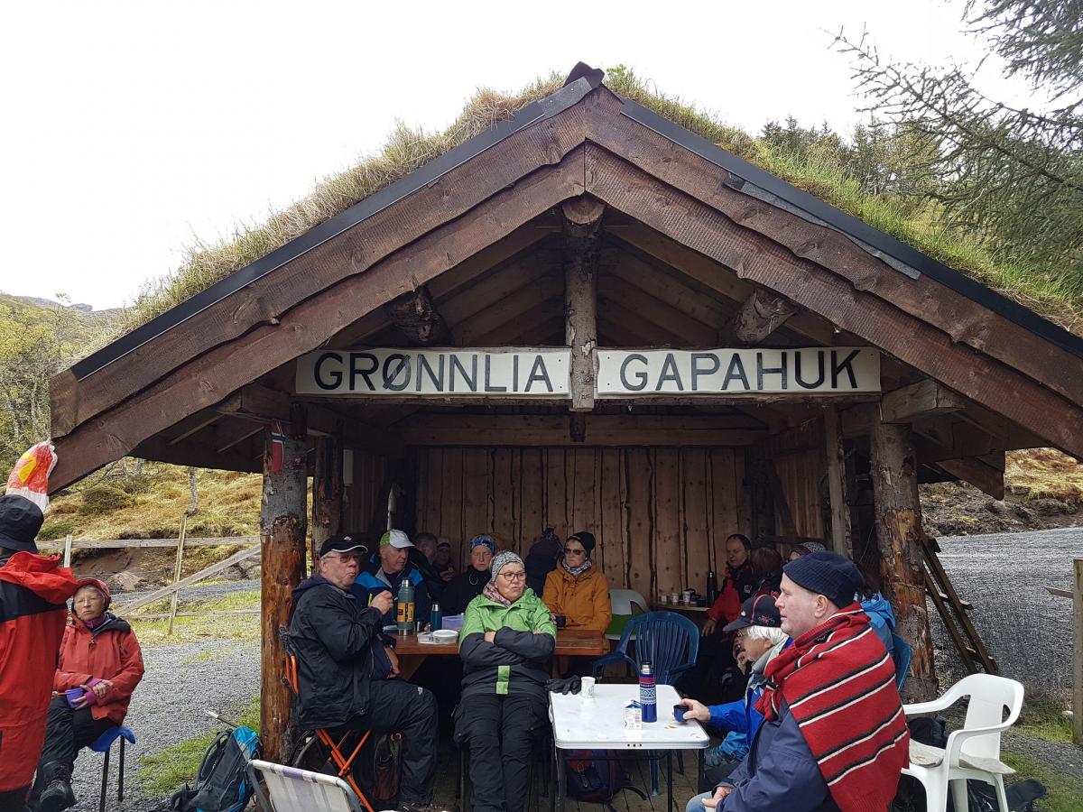 Turveien vår var lett å gå, og framme ved Grønnlivannet fikk vi sette oss ned med turmaten og kaffen. Der er det bygd en fin gapahuk med fin utsikt over vannet. Ketil med familie står bl.a.bak dette arbeidet, og da fikk vi orientering om arbeidet som var nedlagt, og om et anlegg som er myntet på rekreasjon for alle, men særlig også for funksjonshemmede og eldre. Her er det også ordnet med et flott avtrede (utedo), der bilde av kongefamilien etter tradisjonen er veggpryd. Vi hører en fin sus fra elven som engang var skille mellom kommunene Buksnes og Borge. I det hele et sted for å finne hvile og ro. Jeg ble mektig imponert over det som er lagt ned av arbeid for å tilrettelegge for at mange skal kunne komme seg på tur ut i en herlig natur. En stor takk til Ketil Høyen og Are Andersen for orienteringen som ble gitt, og som førte til overrekkelse av historielagets krus.