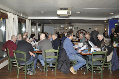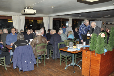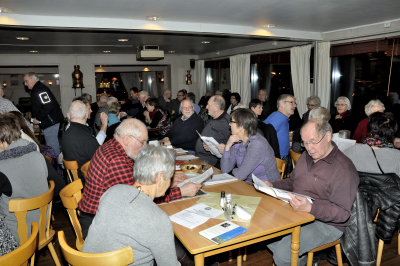 Underveis i møtet hadde vi pause med god servering; snitter og bløtkake. Kafeens mannskap greide brasene med å servere hele den tallrike forsamlingen på kort tid, mens praten gikk livlig rundt bordene.