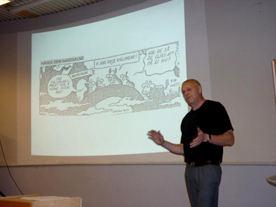 Etter foredraget svarte Gunnar Ingolf greit på spørsmål fra salen. Stor applaus etterpå! Formann Bugge takket han for en utrolig interessant innføring i vår fortid. Han gav ham en DVD laget av organist A.Pirozhkov – fotos fra Lofoten og med egen musikk. ” Når heimlengselen blir for stor, kan du sette den på” sa Kolbjørn, ” og så får du et av Historielagets krus til å ha på kontorbordet til kaffe, som et daglig minne”