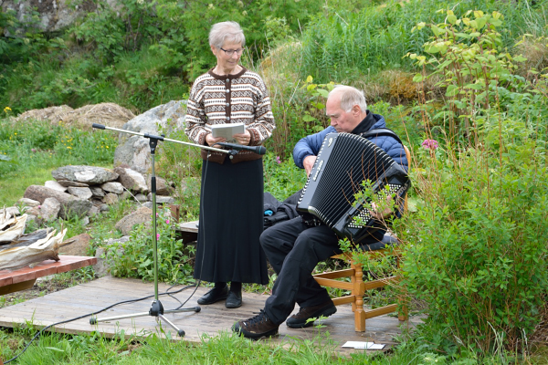 Turid Pedersen og Robert Solberg åpner Skaftnesdagen med diktlesning og musikk.