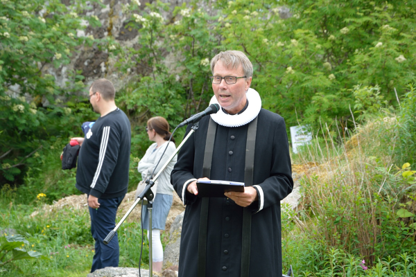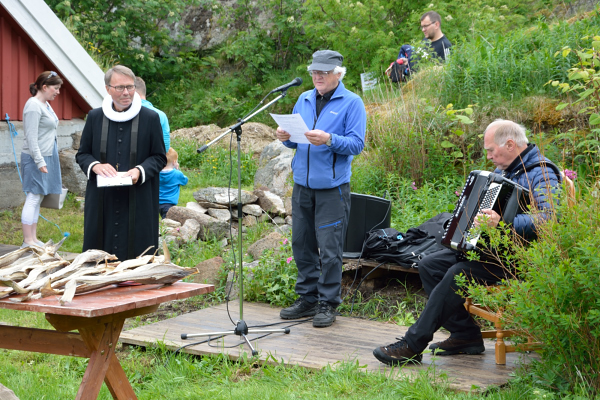 Robert Solberg akkompagnerer til fellessang, og prest Harold Holtermann framfører "ord for dagen".