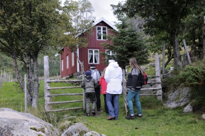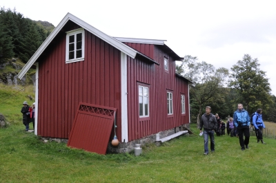 Innerst i dalen finner vi et fint og rødmalt hus som er renovert og står og minner om en tid da det var god aktivitet og fast beboelse der.. Nå er det fritidshus, og gjestfriheten til huseierne gjorde at vi fikk komme inn for å nyte vår kaffe i trivelig og historiske omgivelser. Her fikk Terje gi oss flere detaljer om dalens  historie - en gjennomført god oppdatering  fra en svunnet tid, der folk enda så mulighetene for å ha et sted å bo og et utkomme ,selv om det nok kunne være slitsom og knagert til tider.