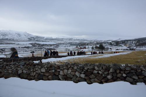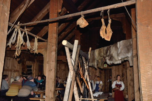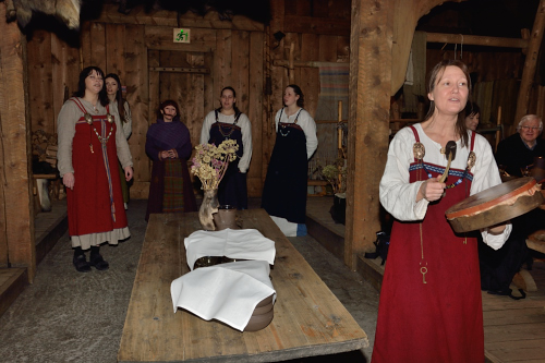 ​Deltakerne går opp til vikinghuset for servering av lammesodd.
